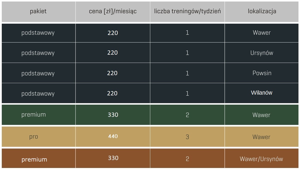 *opłata miesięczna jest stała i nie jest uzależniona od ilości jednostek treningowych w danym miesiącu oraz nie podlega zmniejszeniu przy nieobecności uczestnika